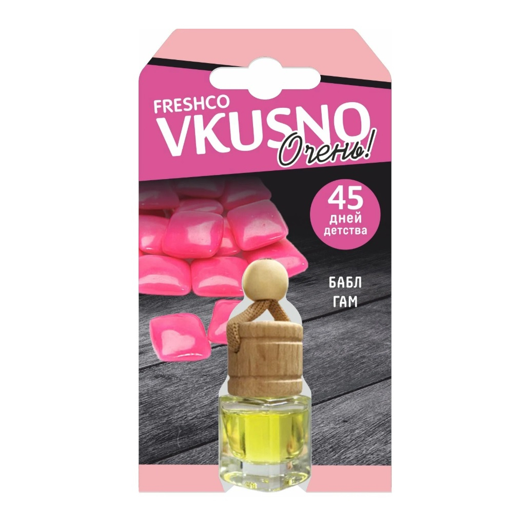 Ароматизатор-флакон Freshco Vkusno Очень! AR1VB010, подвесной, бабл-гам, 35 мл создан для тех, кто любит яркие и сладкие ароматы. Он наполнит салон вашего автомобиля веселым и вкусным запахом жевательной резинки. Вы будете чувствовать себя как в детстве. Аромат напоминает вкус любимой жевательной резинки с фруктовыми нотками. Он поднимает настроение и делает поездки более приятными. Флакон работает до 4 недель, постепенно выделяя аромат.