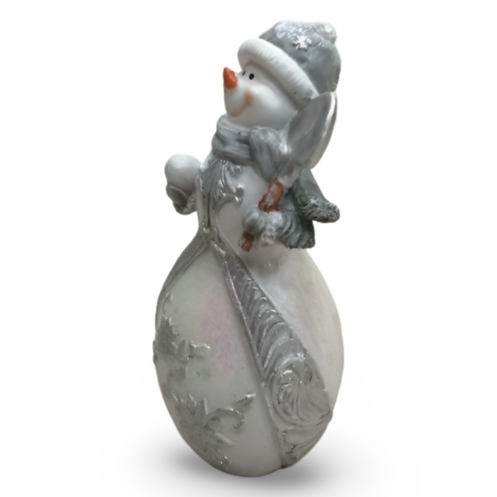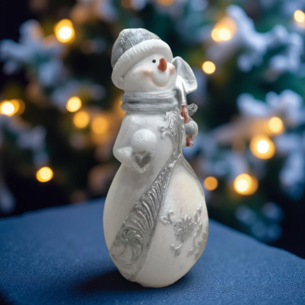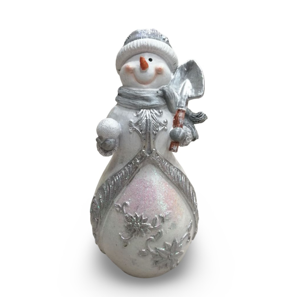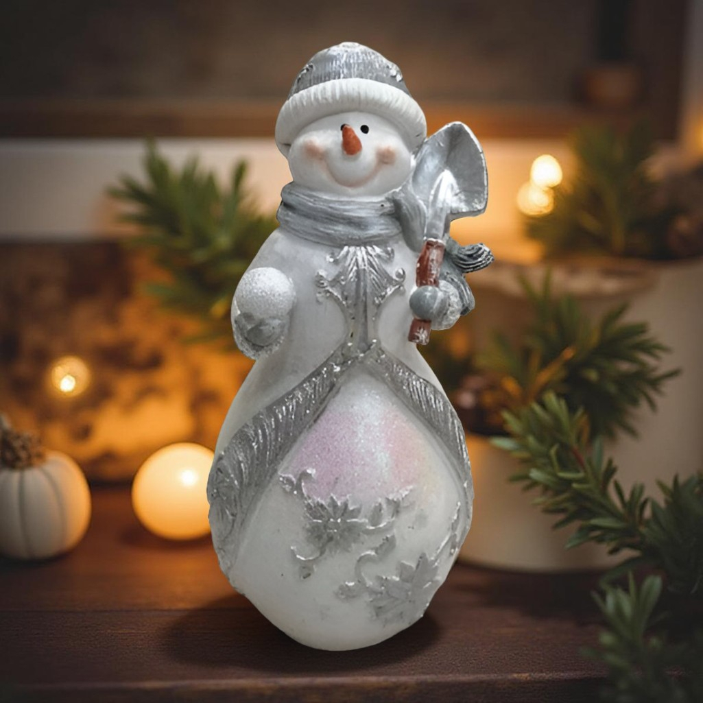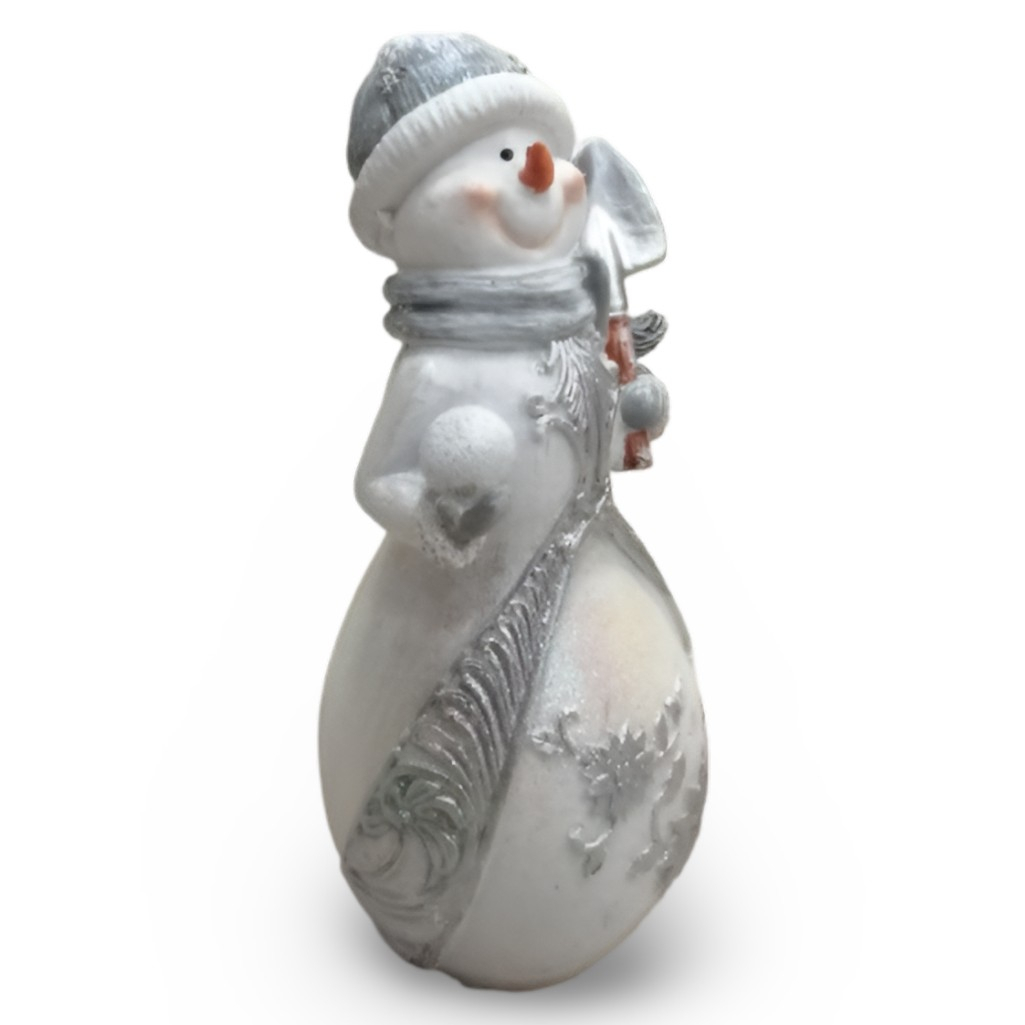 Фигура декоративная Снеговик с лопатой и снежком, новогодняя — изящное настольное новогоднее украшение в классической бело-серебристой гамме. Компактная фигурка высотой 21 см создаёт уютную праздничную атмосферу, идеально дополняя декор полок, камина или праздничного стола.