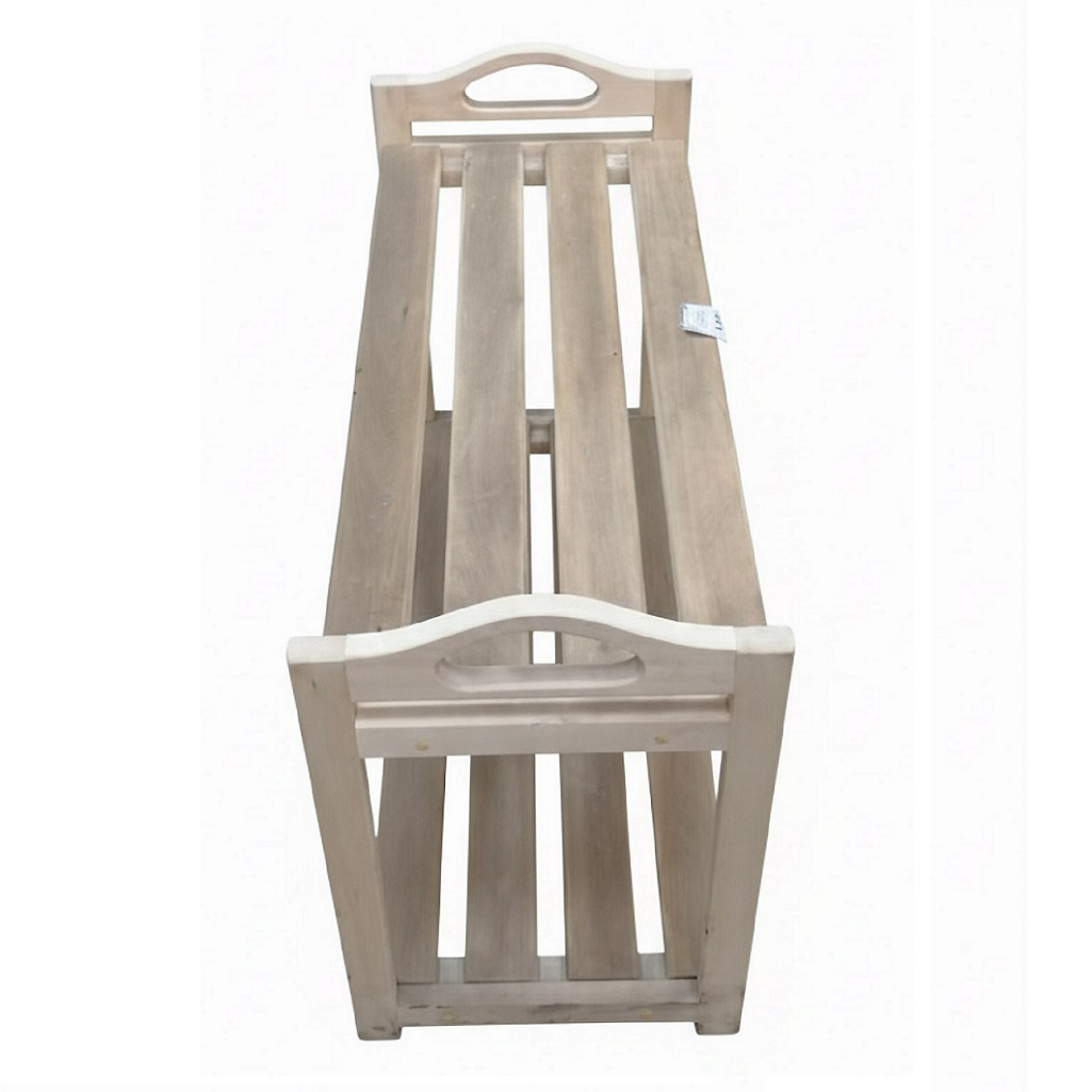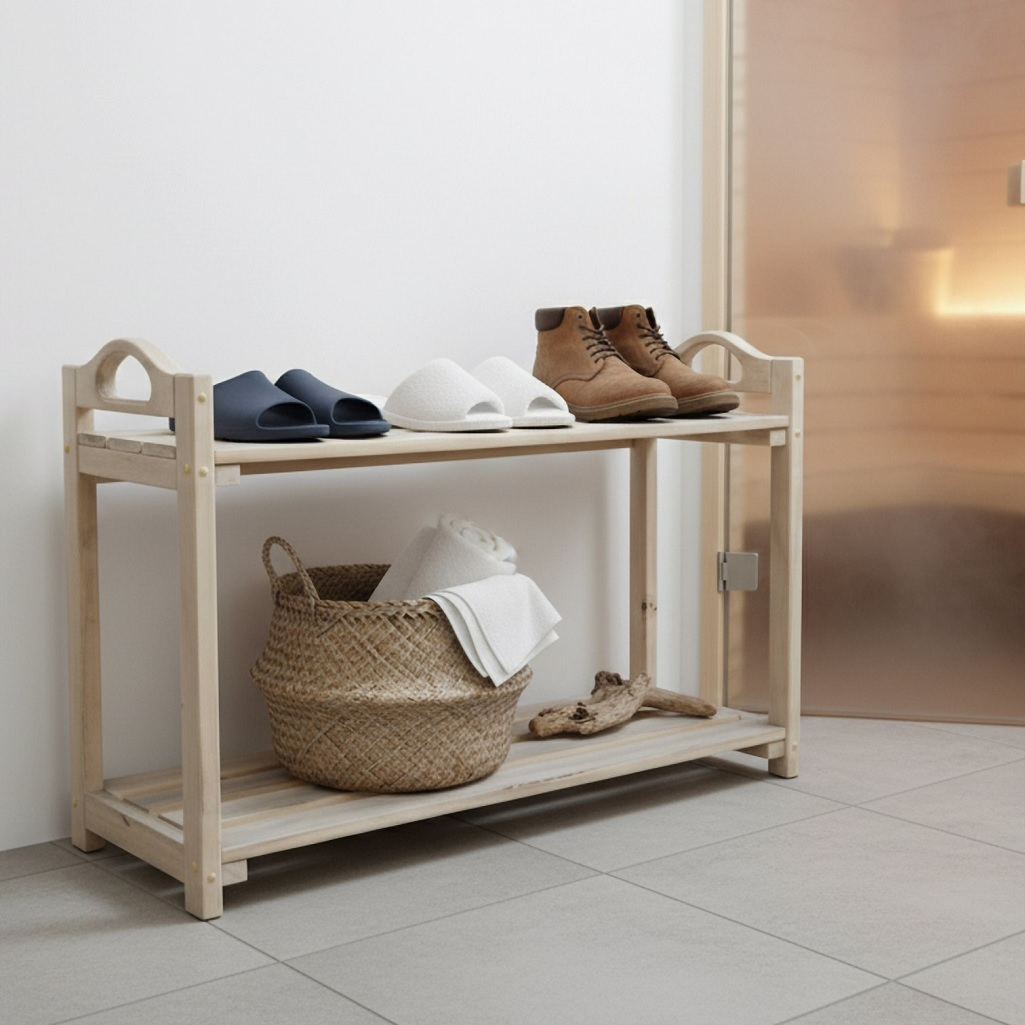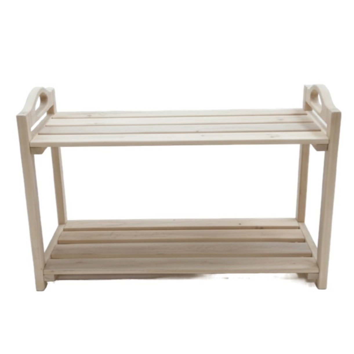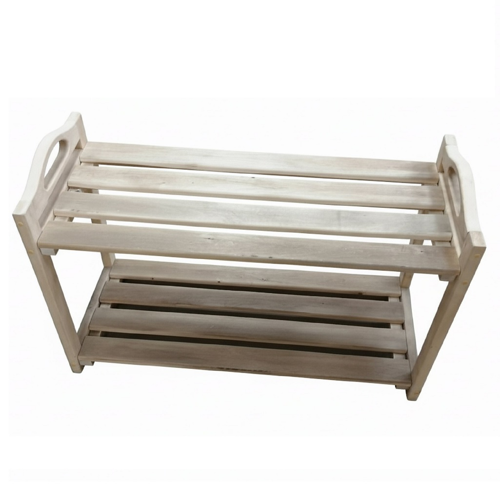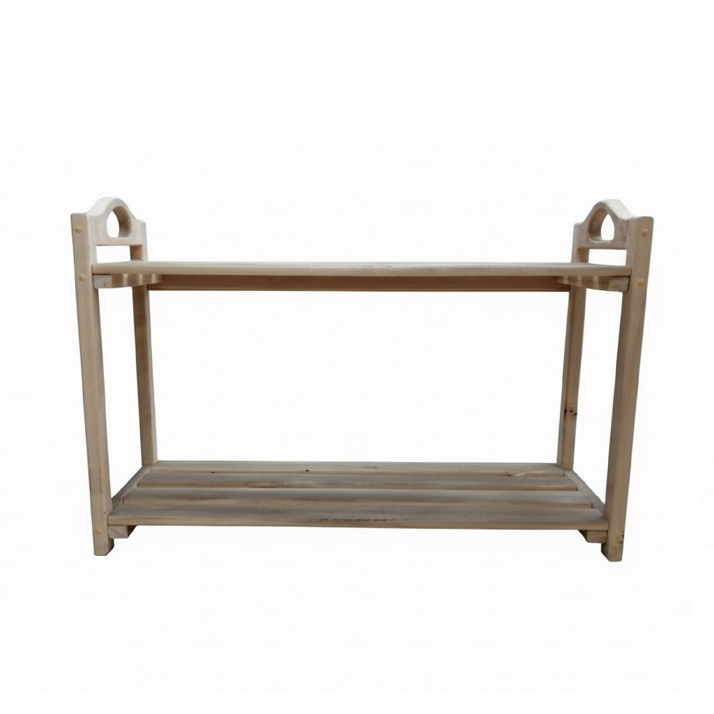 Подставка под обувь, Липа, для бани и сауны, резные ручки, 2 полки, 350х450х700 мм, дерево представляет собой двухъярусную этажерку для хранения обуви, изготовленную из массива липы. Массив натурального дерева - экологически чистый, «дышащий» материал, который создаёт в прихожей атмосферу тепла, уюта и природной гармонии. Бежевый или натуральный оттенок дерева универсален и легко вписывается в большинство интерьерных стилей (скандинавский, кантри, классика, эко-стиль). Две полки позволяют компактно разместить 4-6 пар обуви (в зависимости от размера), сохраняя порядок в предбаннике, и защищая обувь от деформации при хранении в куче. Подставка приподнимает обувь над полом, улучшая проветривание и упрощая уборку.
