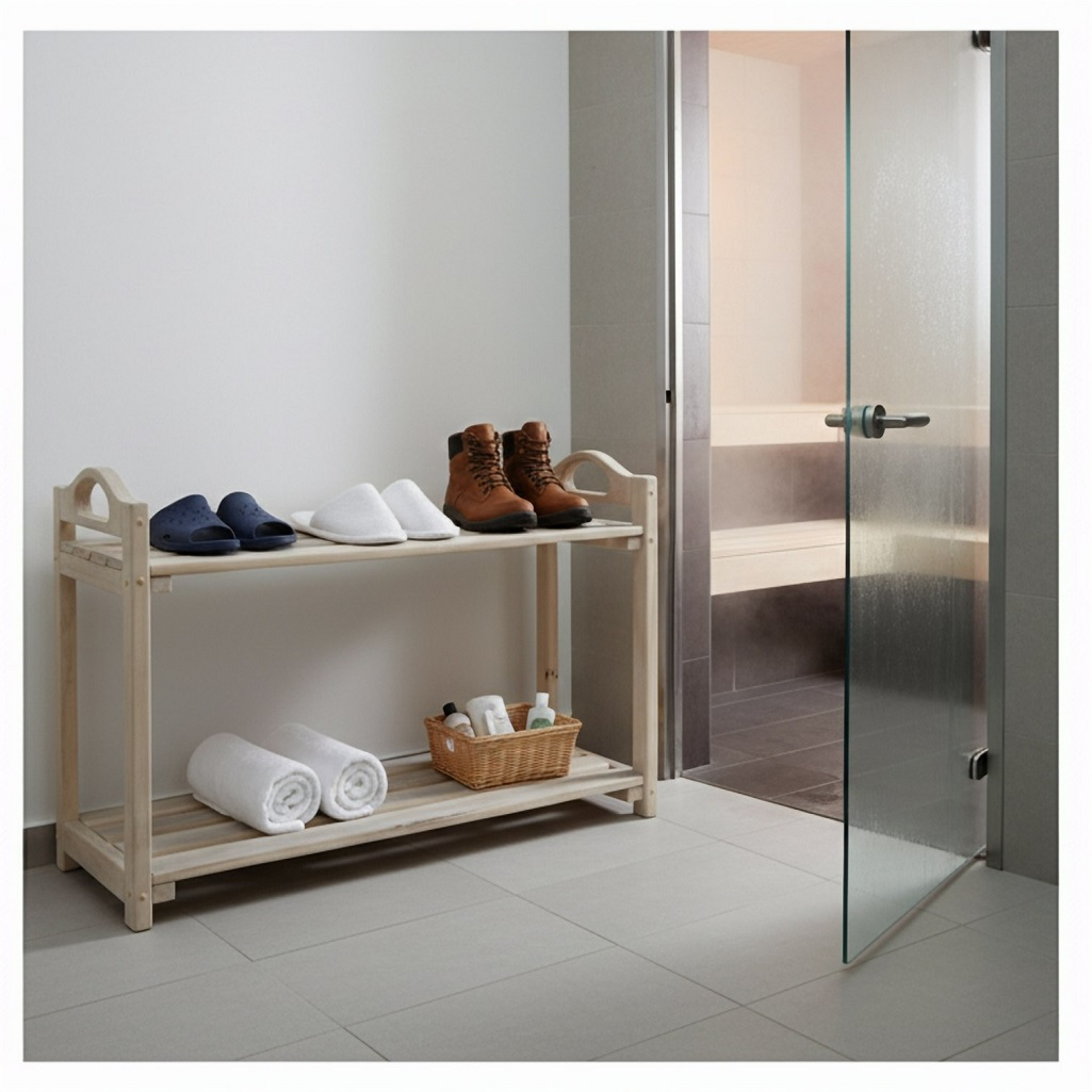 Липа сочетает в себе достаточную прочность для бытовой мебели с малым весом. Это делает подставку устойчивой, но при этом её легко передвигать или переносить при необходимости. При правильной обработке (покрытие лаком или воском) дерево устойчиво к влаге и истиранию. Поверхность приятна на ощупь, не холодит, как металл, и выглядит благороднее пластика. Двухъярусная конструкция экономит площадь пола в предбаннике.