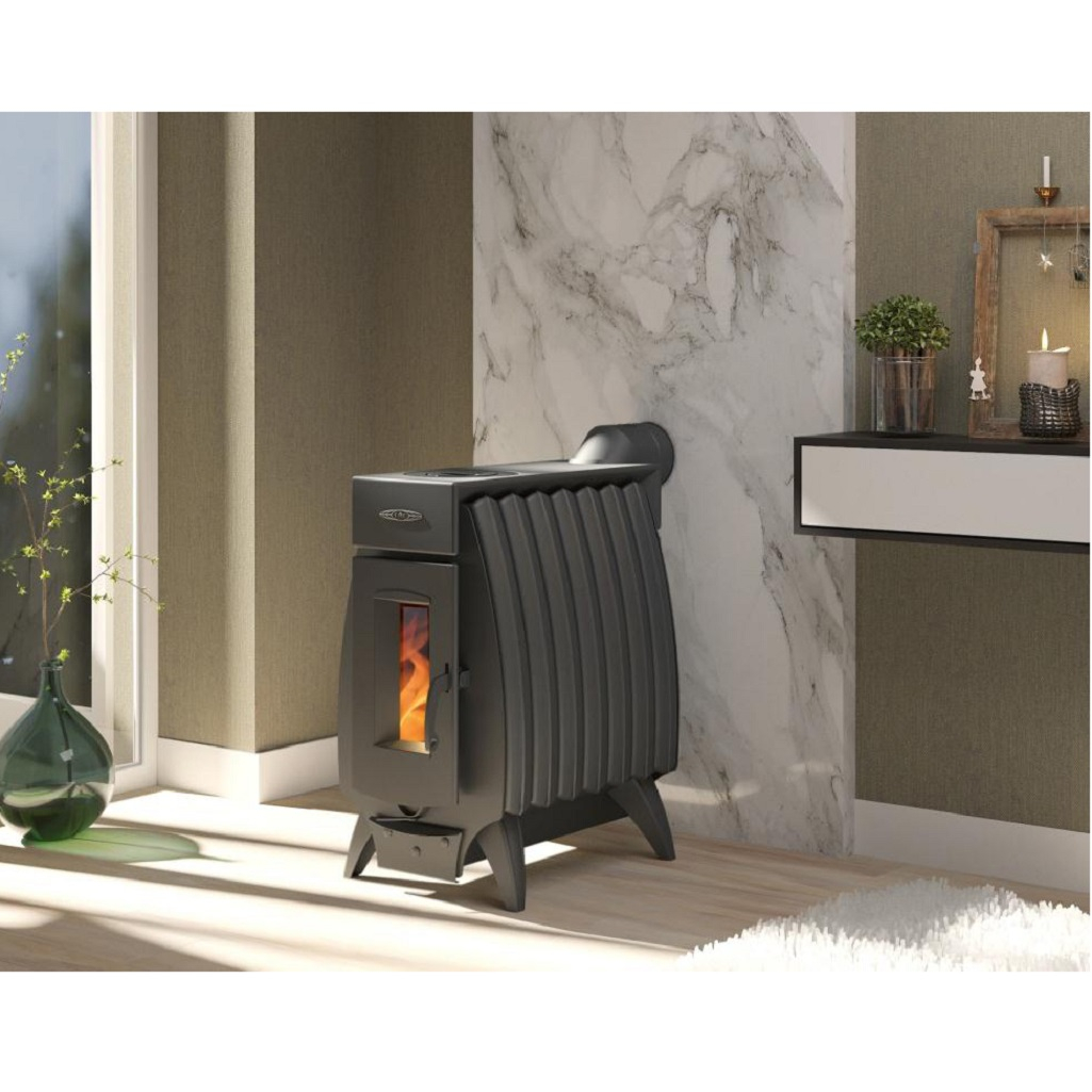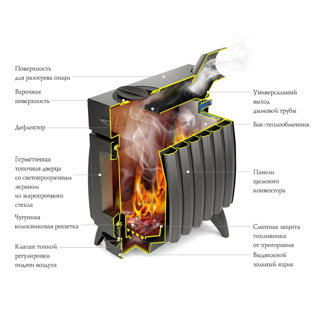 Печь отопительная TMF Огонь-Батарея 9 антрацит, 13 кВт, d120 мм, до 200 куб.м предназначена для экономичного воздушного отопления жилых и нежилых помещений объемом до 200 м³, а также для приготовления и разогрева пищи. Элегантный внешний вид печи позволяет установить ее в любом современном жилом помещении. На видимых поверхностях печи нет ни одного сварного шва. Самый вместительный топливник в своем классе позволяет загрузить в печь максимальное количество дров для длительного непрерывного горения. Сменная защита от прогорания предохраняет нижнюю часть топливника печи в месте скопления горячих углей. При необходимости защита легко меняется на новую в домашних условиях. Герметичный зольник с замком исключает неконтролируемый подсос воздуха на колосник. Тонкая регулировка интенсивности горения позволяет бесступенчато выбирать любой режим горения: от интенсивного до полного затухания печи. Топливо для печи: дрова длиной до 545 мм.
