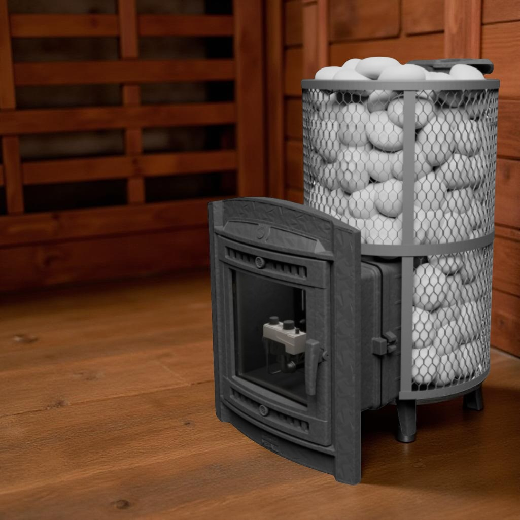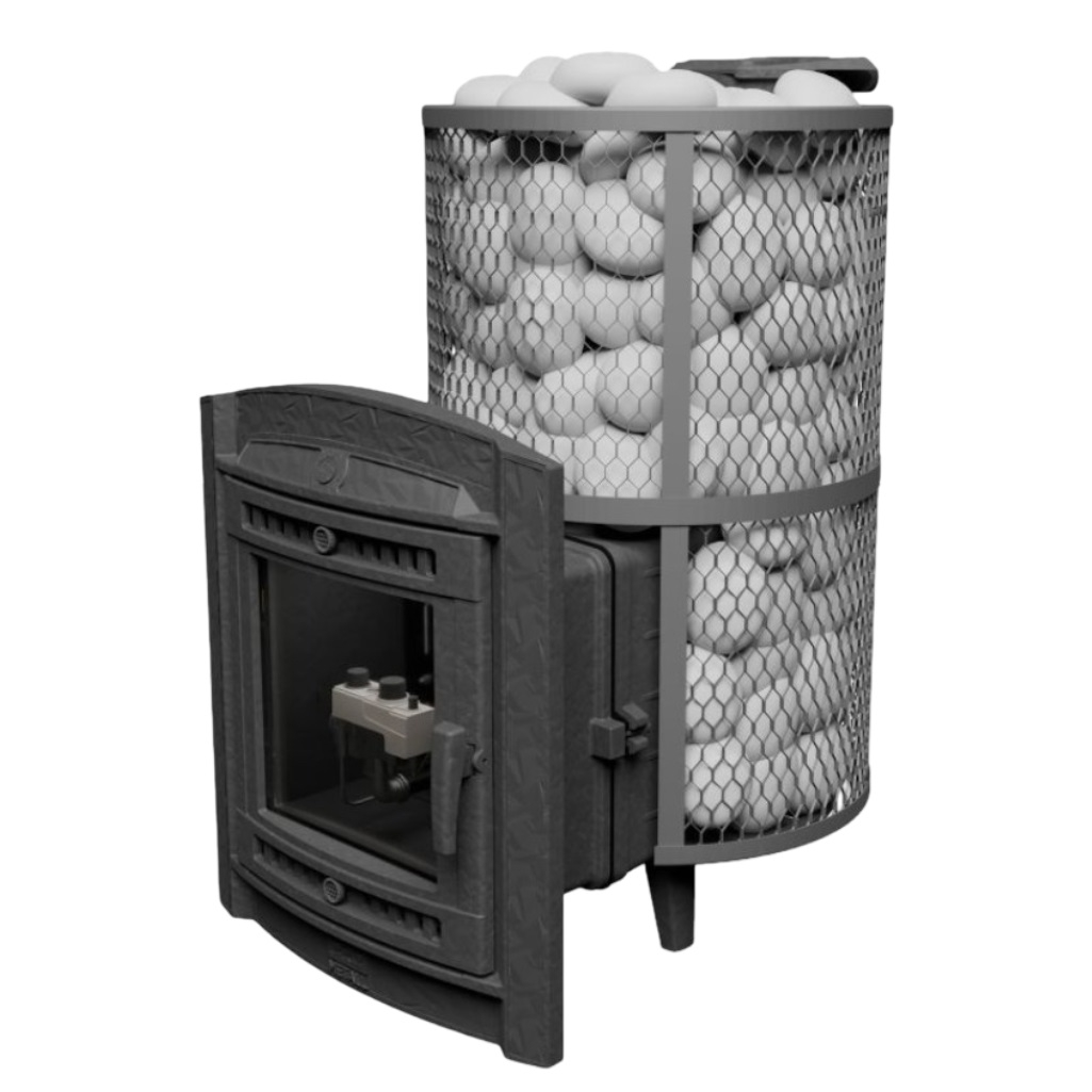- Печь банная чугунная "Атмосфера L" сетка из нержавейки с газовой горелкой (8-20м3. d115/140)