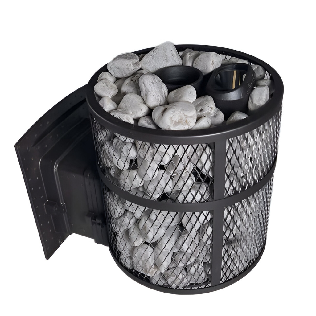 Печь для бани Атмосфера М, чугун, сетка из нержавейки, 14 кВт, d115, до 14 куб.м - это маленькая, но не менее надёжная банная печь для небольших парных помещений, объёмом до 14 куб.м. Печь Атмосфера М отлично подойдёт для небольших частных парных и будет служить долгие годы своему владельцу. Ультра компактная модель банной печи. Кожух печи изготовлен в виде сетки из нержавеющей стали и полностью заполняется природными камнями, обеспечивая высокую динамику нагрева парильного помещения. Максимальный вес камней достигает 110 кг, подключение дымохода производится сверху.