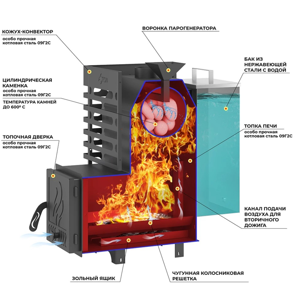 Печь для бани Aston 16 Аква, дверца глухая, 16 кВт, d115, до 18 куб.м предназначена для нагрева парилки объемом от 14 до 18 куб.м. Печь оснащена закрытой каменкой для создания легкого пара. Это каменка с сеткой-кожухом для камней. Основные характеристики: стальной кожух-конвектор быстро нагревает воздух в парилке благодаря мощному воздушному потоку. Топочная дверка позволяет регулировать подачу воздуха. Универсальный парогенератор проходит через трубу-каменку, обеспечивая мелкодисперсный пар. Глубокая невентилируемая труба-каменка из стали 09Г2С толщиной 4 мм нагревается открытым пламенем для максимального прогрева камней и выполняет функцию пламегасителя. Большая масса камней в сетке-кожухе обеспечивает стабильную температуру в парилке и служит мощным парогенератором. Длинная колосниковая решетка из чугуна обеспечивает равномерное и интенсивное горение дров. Съемное дно топочной камеры упрощает обслуживание печи и контроль поддувального пространства.