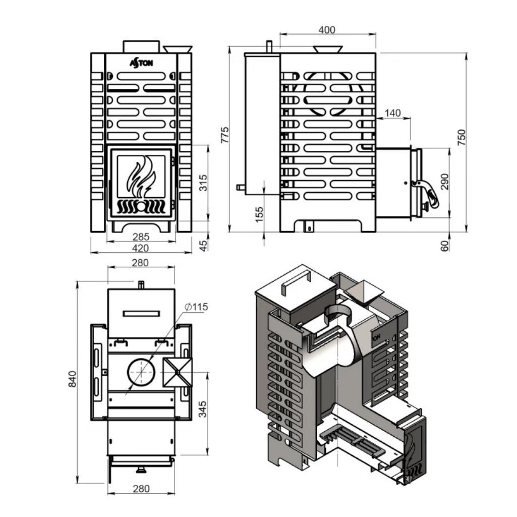 Описание печи Aston 16 Аква, дверца глухая, 16 кВт, d115, до 18 куб.м