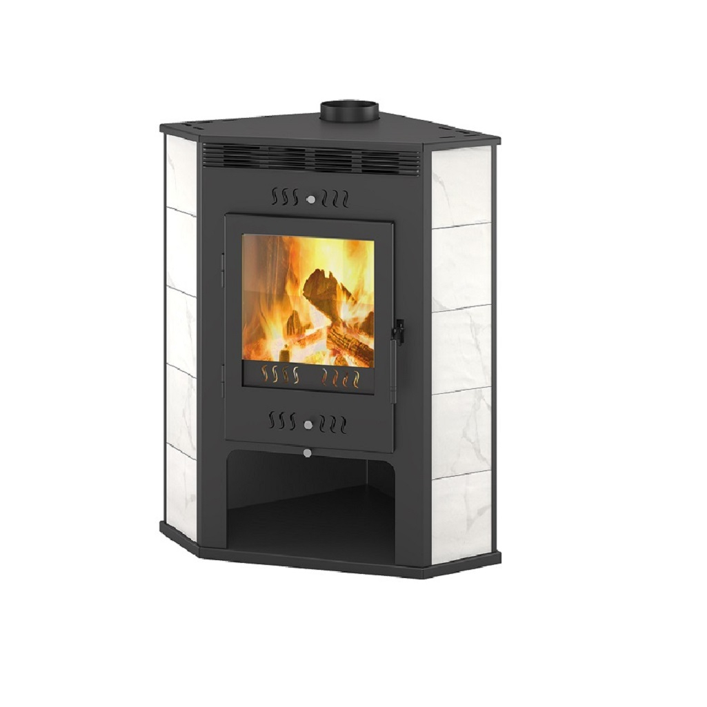 Печь-камин Везувий ASTON, угловой, 11 кВт d150 мм, до 180 куб.м предназначена для обогрева помещений объемлм до 180 м3. Печь выполнена из прочной котловой стали марки 09Г2С, а наиболее термонагруженные участки изготовлены из нержавеющей стали марки AISI 430. Печь топится дровами, номинальная мощность составляет 11 кВт. Топка камина изнутри футерована вермикулитовыми плитами, они защищают боковые стенки и дно топки от тепловой нагрузки. Вермикулит накапливает в себе тепло и постепенно отдаёт его в окружающее пространство. Рекомендуемая длина дров - не более 40 см. Воздух для горения подаётся через чугунный колосник на дне топочной камеры. По задней стенке топочной камеры идет канал для подачи воздуха на вторичный дожиг. Для ускорения движения воздуха и прогрева помещения между облицовкой и корпусом печи устроены щелевидные конвекционные каналы. Снаружи печь-камин отделана керамической плиткой. Печь-камин оснащена дверью в топку с большим обзорным стеклом. Керамическое стекло выдерживает значительные температуры- до 650°C в режиме постоянного нагрева, она обеспечивает простой контроль за горением дров в печи. Дверь оснащается верхней и нижней подачей воздуха: снизу воздух подаётся в поддувальное пространство, сверху – на внутреннюю поверхность стекла.