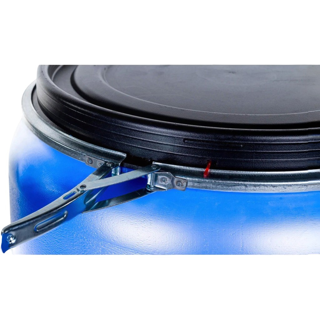 Описание бочки 220 литров, вымытая, полиэтиленовая, с крышкой на железном обруче, синяя