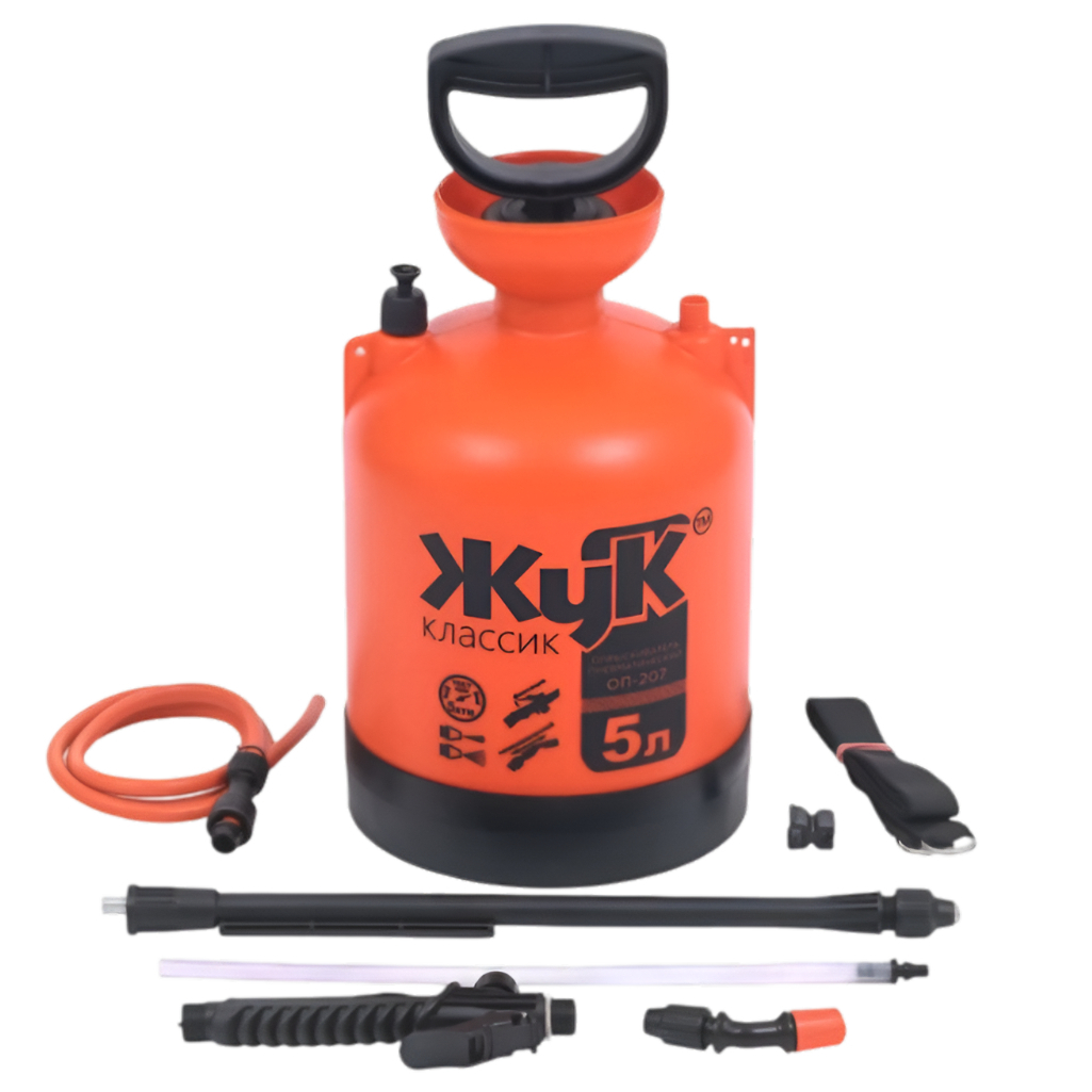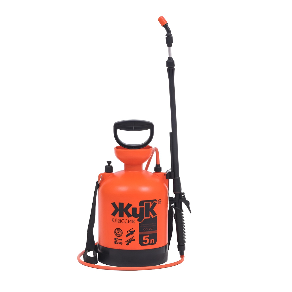 Опрыскиватель ЖУК ОП-207, 5 л, 29561 — садовый ручной опрыскиватель помпового типа для химической защиты растений от вредителей и болезней, уничтожения сорняков, а также для обработки поверхностей моющими средствами и чистки стен и окон. Объем бака — 5 литров, материал — высококачественный пластик.