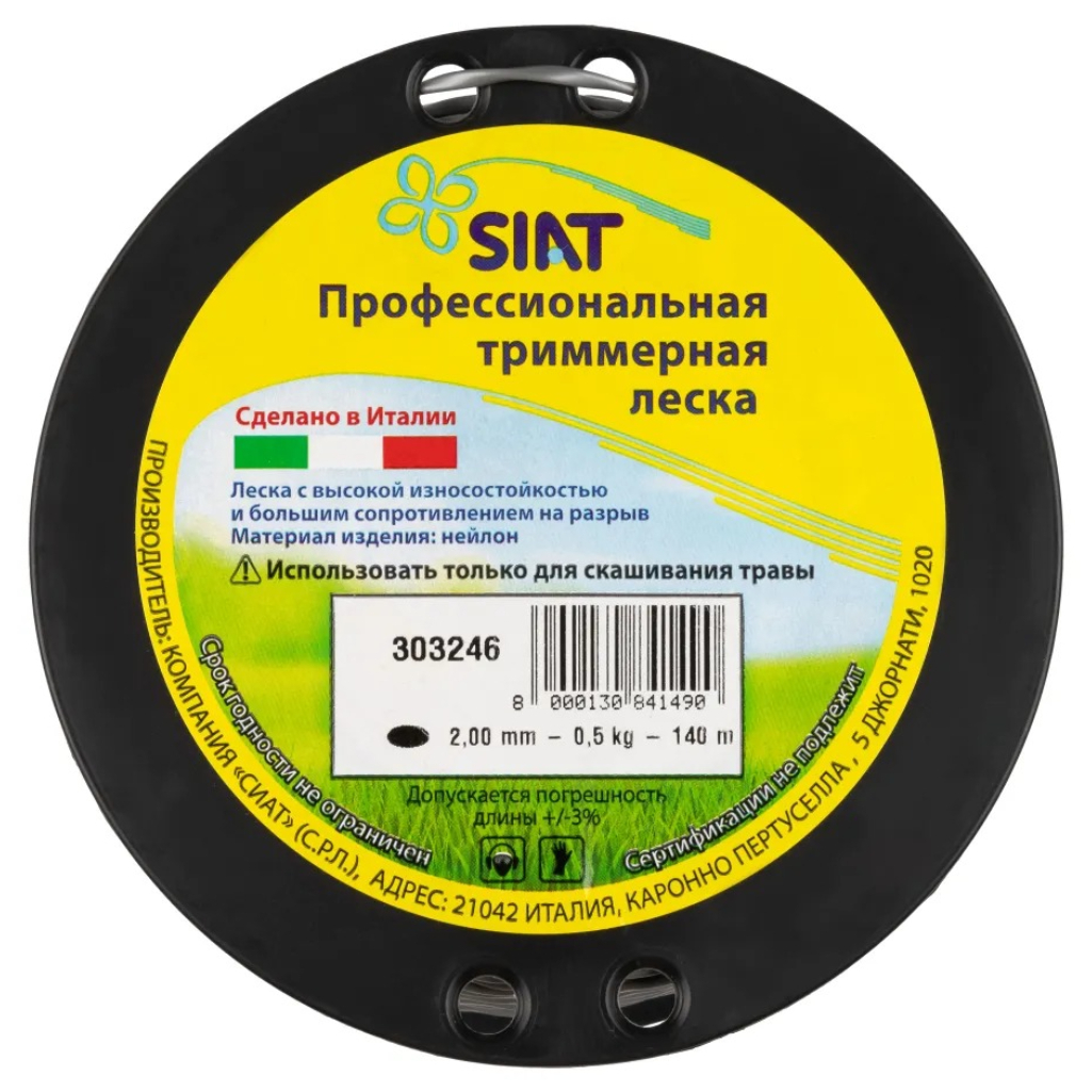 Леска для триммера SIAT Challenge 303246, диаметр 2.0 мм, длина 140 м, крученый эллипс - это профессиональная леска, которая имеет очень высокую износостойкость и большое сопротивление на разрыв. Леска подходит к любому типу триммеров. Высокая степень износостойкости, эффективная работа при высоких температурах и нагрузках, единый диаметр на всю длину нити и насыщенный цвет выделяют эту леску из многообразия вариантов. Форма эллипс еще называется овальная или витой овал. Необходимо правильно подбирать леску по основным характеристикам, потому что нужный вариант лески и ее сечения для определенных работ существенно влияет на скорость кошения и износ лески. Приобретайте этот высококачественный товар и наслаждайтесь лёгким и эффективным уходом за вашим садом.