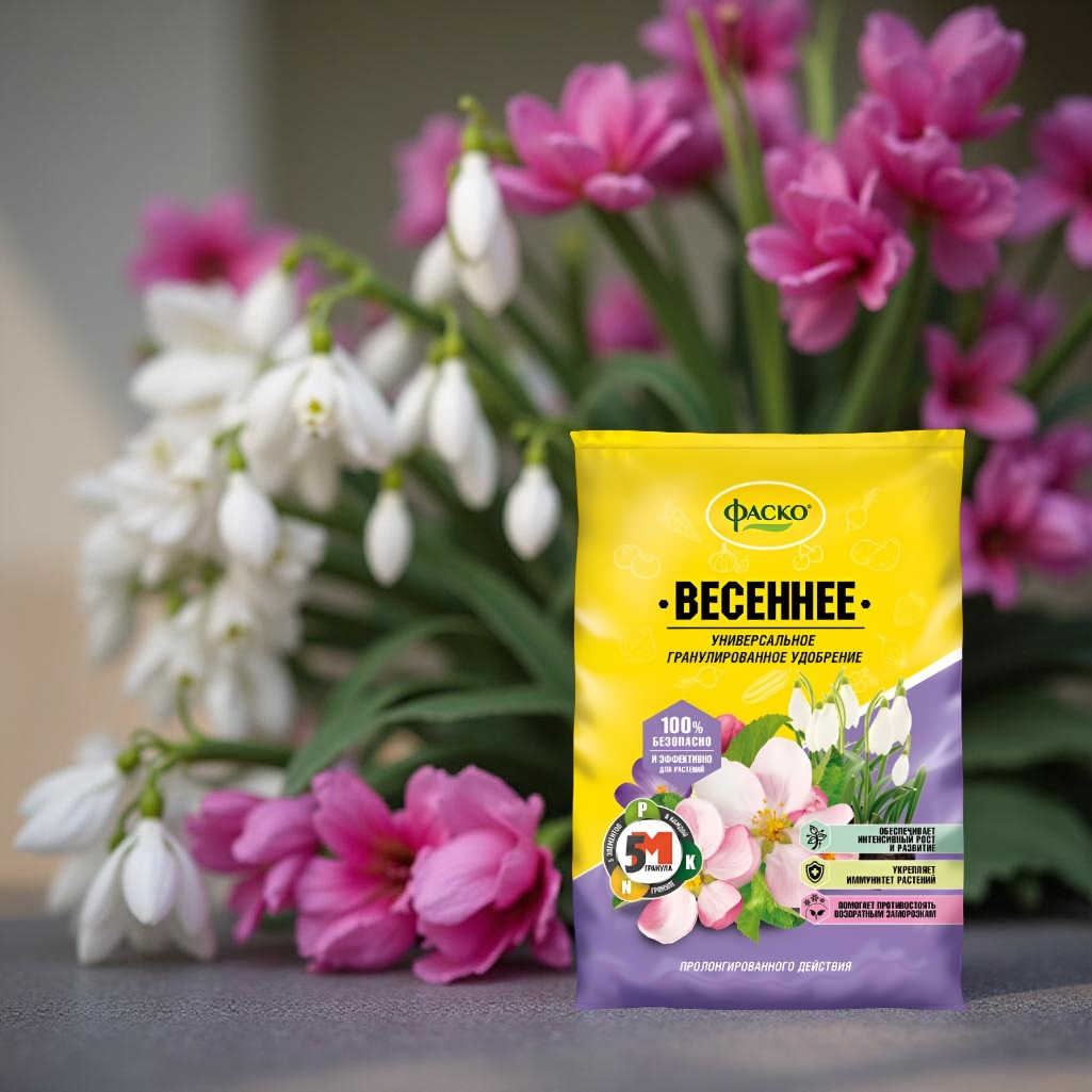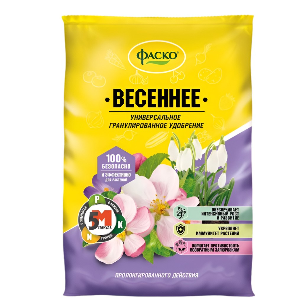 Удобрение Фаско Весеннее универсальное гранулированное, 2.5 кг - это комплексное органоминеральное удобрение длительного действия с микроэлементами специально разработано для подкормки овощных, плодово-ягодных и цветочно-декоративных культур в начале вегетационного периода. Содержит азот в повышенном количестве, что особенно важно весной и в первой половине лета, когда растения интенсивно растут и развиваются. Рекомендуется использовать в открытом и закрытом грунте на всех типах почв, а также в горшечной культуре. Удобрение Фаско Весеннее стимулирует деятельность почвенной микрофлоры, ускоряет пробуждение корней после зимы, улучшает всхожесть семян и укрепляет защитные силы растений. Оно также способствует активному росту наземной части растений, обильному цветению и образованию завязей.