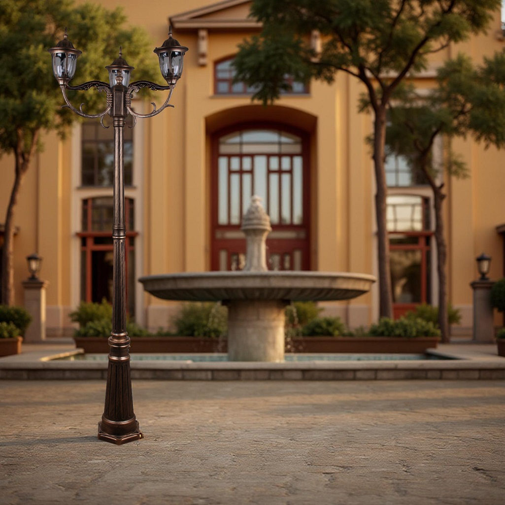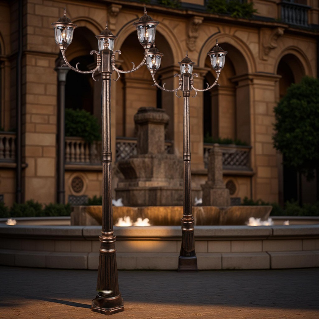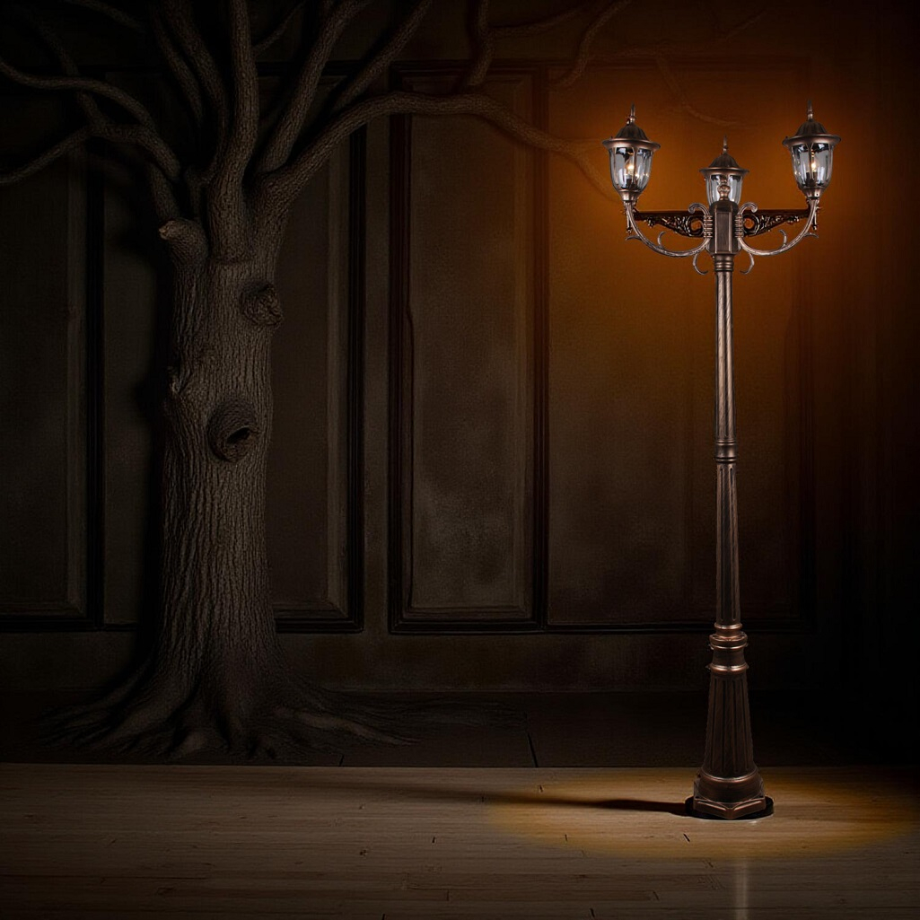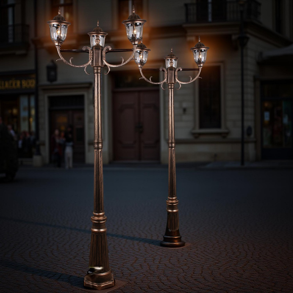 Светильник уличный Reluce 00867-0.7-003SL 2.0M BKG ландшафтный, 60 Вт, Е27, IP44, бронза предназначен для оформления садов и парков, украшения уличных композиций, декорирования придомовых территорий. Площадь освещения составляет примерно 9 кв.м. Светильник крепится на грунт, светильник имеет высоту 200 см. Конструкция плафонов, которые выполнены в старинном стиле, защищает стеклянную часть от осадков. Плафоны и основание светильника изготовлены из металла. Светильник оснащен 3-мя плафонами. Лампа накаливания мощностью 60 Вт обеспечит яркий свет на территории. Маркировка IP44 означает защиту устройства от проникновения пыли, однако, светильник не защищен от сильного дождя или полного погружения в воду.