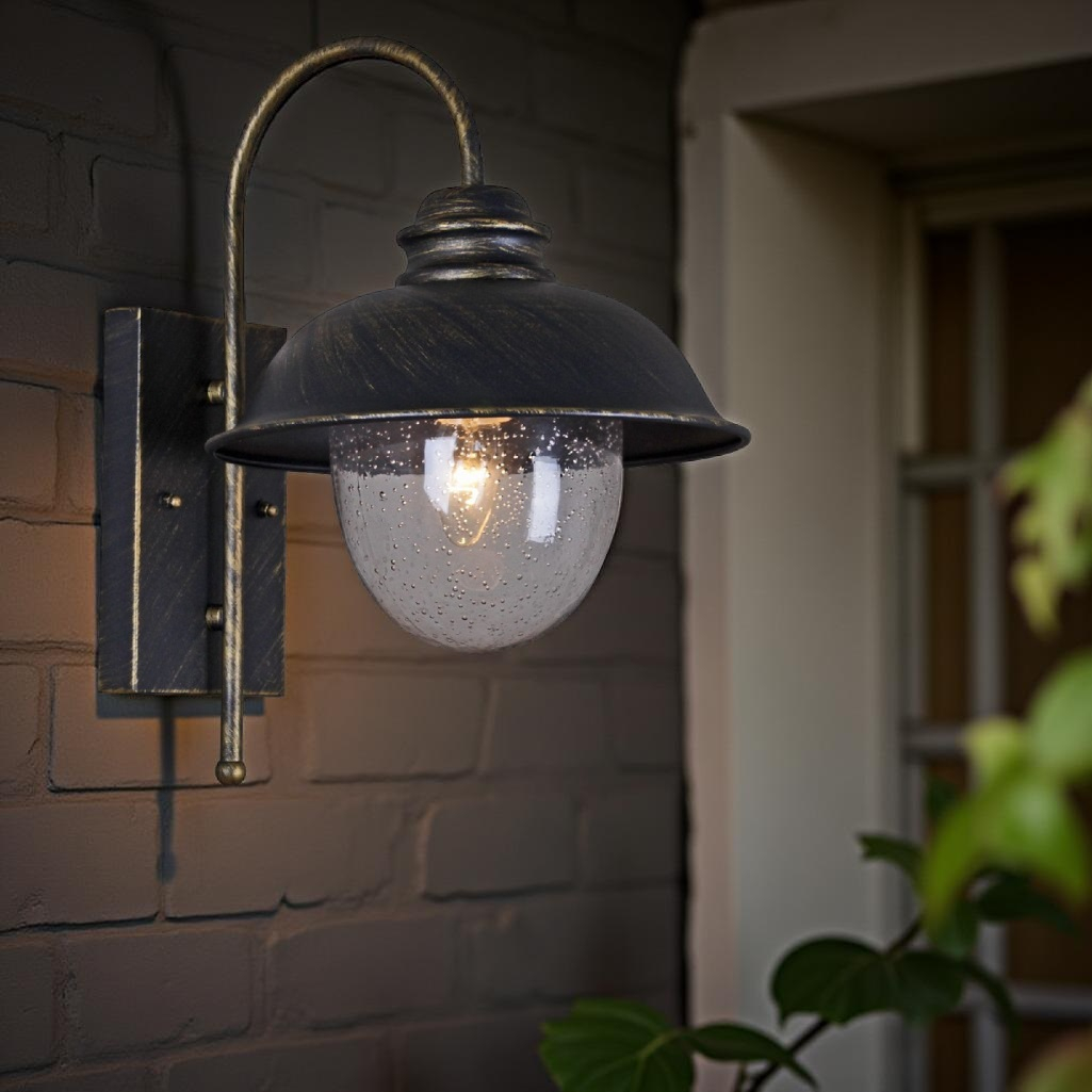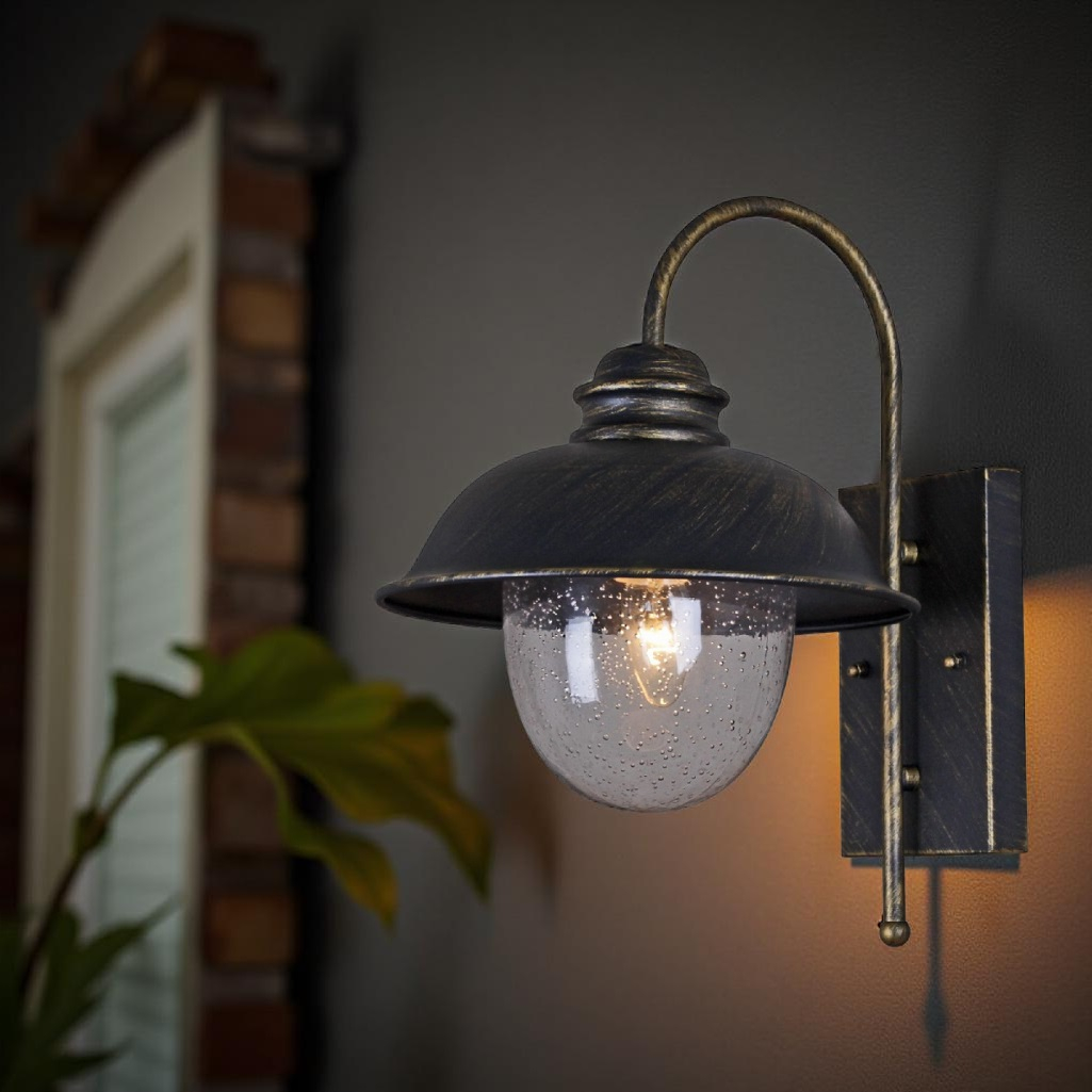 Светильник уличный Reluce 08300-9.2-001SJ BKG настенный, 40 Вт, Е27, IP54, черная бронза используется для декоративной или комбинированной подсветки фасадов зданий, а также для оформления внешнего пространства кафе и ресторанов. Площадь освещения составляет 2 кв.м. Настенный монтаж светильника позволяет экономить пространство. Конструкция плафона, который выполнен в классическом стиле из металла, сверху защищает стеклянную часть от осадков. Лампа накаливания мощностью 40 Вт обеспечит яркий свет на территории. Маркировка IP54 означает защиту устройства от проникновения пыли и подходит для использования на лице, если изделие защищено от прямого попадания воды.